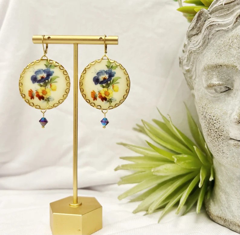 Be the first to review “VINTAGE LARGE FLORAL glass cabochon Swarovski iridescent crystal earrings”